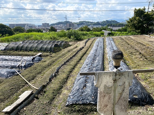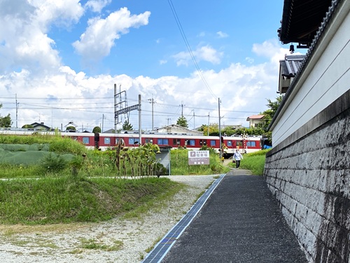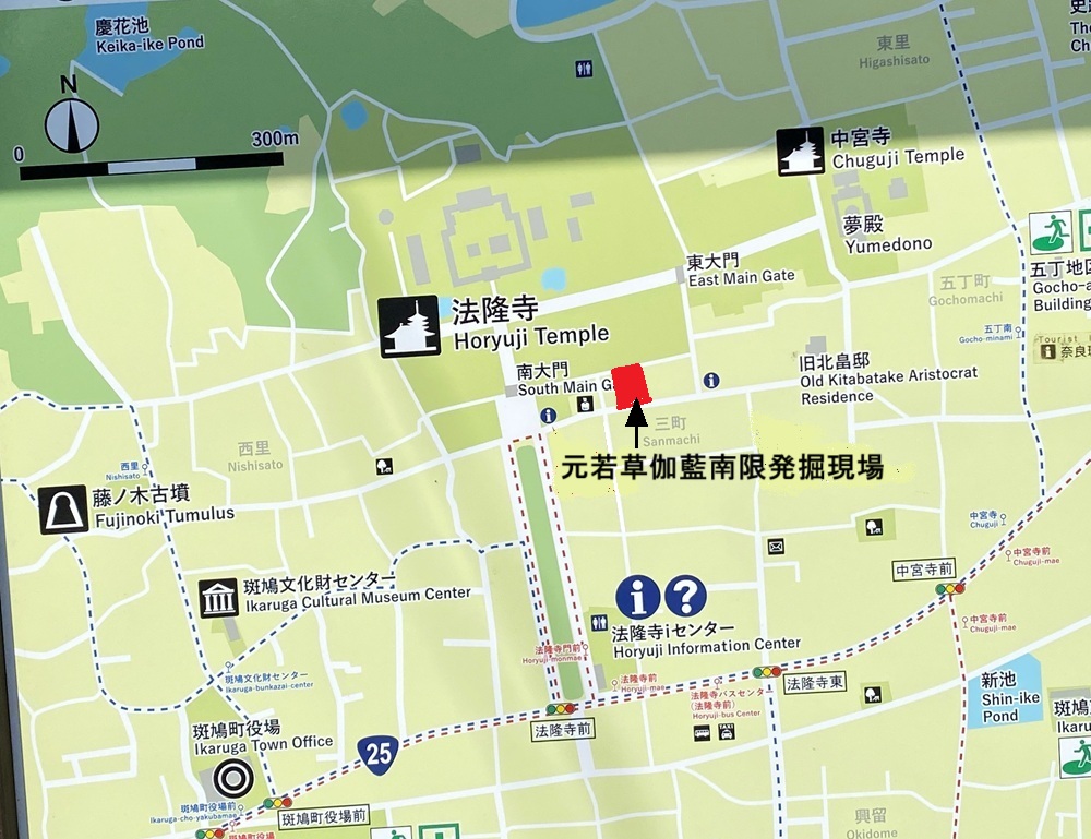 今回はあくまで古道を歩くことが主眼なので寺内には入らず、南大門から中門越しに五重塔と金堂を拝して失礼する。そのことより前々から気になっていること、若草伽藍のことである。法隆寺は聖徳太子により推古15年(607)に創建されたとするが、『日本書紀』には天智9年(670)に全焼したという記事がある。しかし、再建されたという記事が見つかっていないことから、明治期以降、法隆寺の再建・非再建論争が盛んに行われてきた。長年に渡る発掘調査の結果、現西院伽藍の南東に位置する若草伽藍が、焼失した創建法隆寺の跡であることが確定された。金堂と塔が一直線に並ぶ四天王寺様式であり、最近(2023~24年)の発掘調査で、塔の南側に推定された南限の斜行溝が確認され、伽藍の南限がわかった。昨年春に発掘調査の報告会があったばかりで、今行っても発掘現場が見られるのではないかと、期待していたのである。