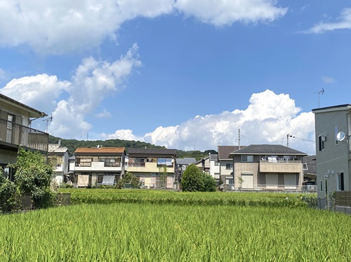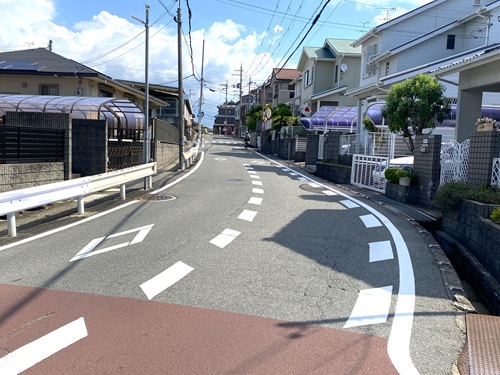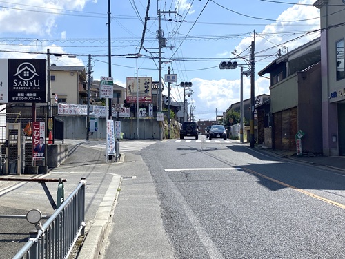 「東信貴ケ丘」「夕陽ケ丘」などという新興住宅地の新しい道を行くことになる。「勢野東」交差点を渡って150mほどのところに五つ角があって、そこを右に行く。どの道も広いアスファルト道路なので古道との区別がつかないが、選んだ道は住宅造成のためにつけた道でないのがわかる。北側の建物は裏面が道と斜めに接していて、沿道の風景は不揃いな印象を与える。少し坂を登ると急角度で左に曲がり、そのあとは緩やかに右左に曲がる古道らしい道となる。古道に交わる道はまっすぐで周りはすべて住宅地だ。昭和20年の航空写真を見ると、勢野からこの辺り一帯は山林で、竜田道はその中を行く山道で、竜田川を渡り法隆寺までつながっている。先ほどの墓地はその西側の山裾にあって、竜田道沿いに広がる勢野の町を見下ろす場所にあった。馬車なんかも走るのんびりした風景が続いていたのだろう。